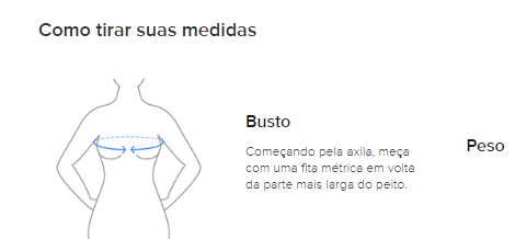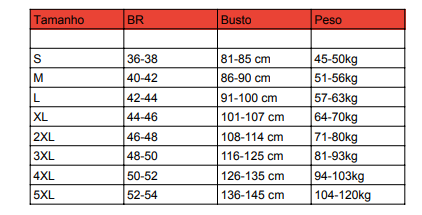 Tamanho do Busto em CM (medir busto para tamanho correto),siga as medidas e não por tamanho, para a compra correta.